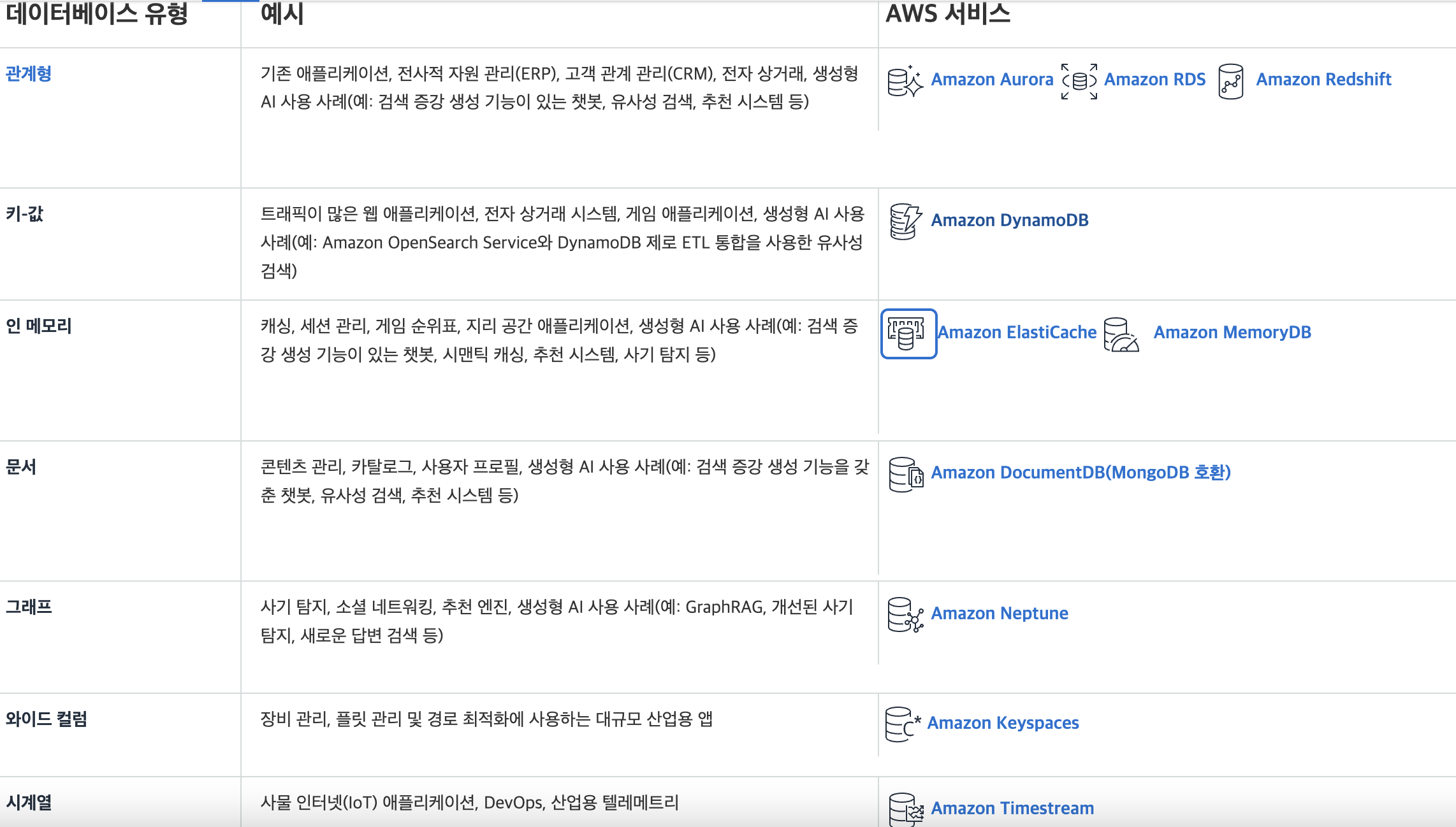 아래는 aws에서 상황에 따라 어떤 자사 db를 선택하면 좋을지에 대한 가이드를 제시한 것이다. 어떤 프로그램을 개발하기 전에 db를 선택할 때에는 유형별로 내가 처해진 상황에 어떤 것이 적합한지에 대한 고민은 필수적이다.