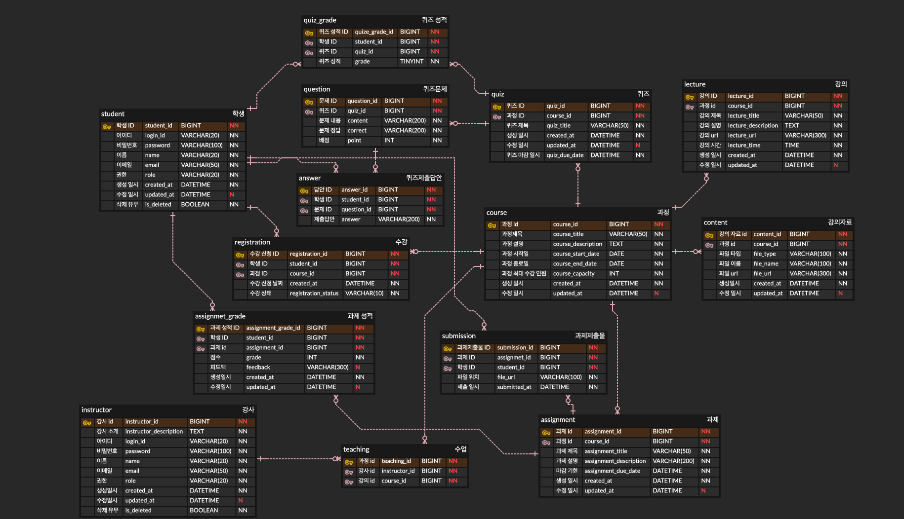 | 학생-강의 성적 조회 | 학생과 강사가 해당 강의 및 퀴즈, 과제 성적을 확인할 수 있는 기능 | quiz_grade, assignment_grade |