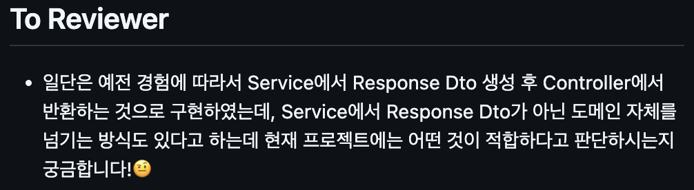 - Controller와 Service 계층 간의 DTO 사용 방식에 대해서 이전에는 고민 없이 Service에서 Response DTO를 반환하여 Controller에서 그대로 응답 값을 사용하였다.