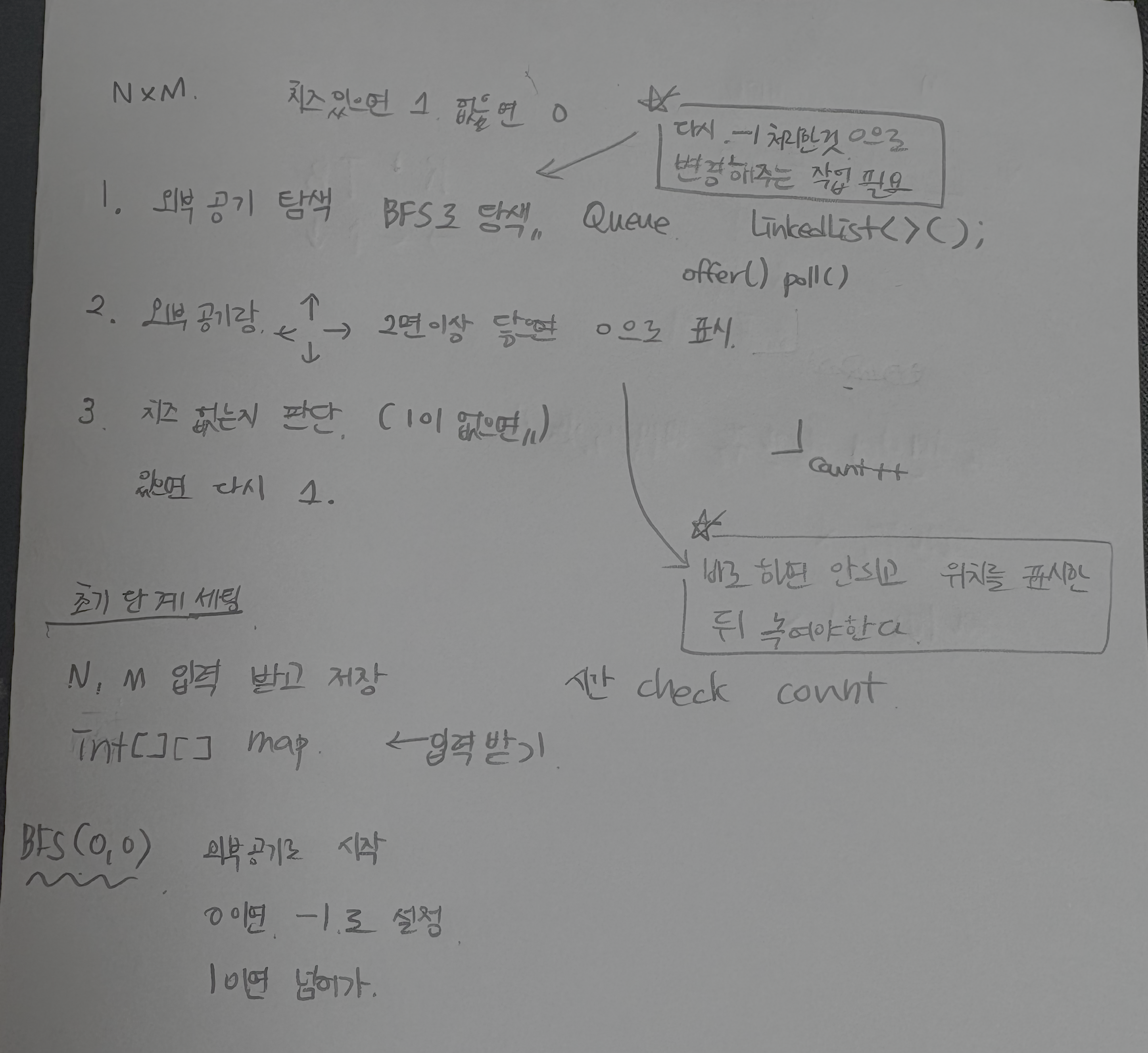 또한 외부 공기를 한 번 확인하고 치즈를 녹이는데 다시 외부 공기를 확인할 때 외부 공기를 다시 판단해야하는데 초기화 하지 않아서 문제가 발생한 것을 알고 코드를 다시 수정하였다.