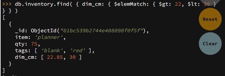db.inventory.find( { dim_cm: { $gt: 15, $lt: 20 } } )- ๋ค์ ์์ ์์๋ dim_cm ๋ฐฐ์ด์ด ์ฟผ๋ฆฌ ์กฐ๊ฑด์ ์ถฉ์กฑํ๋ ์์๊ฐ ํฌํจ๋ document๋ฅผ ์ฟผ๋ฆฌํ๋ค.