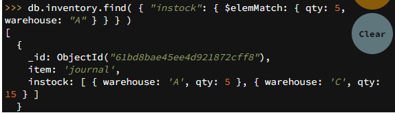 db.inventory.find( { "instock": { $elemMatch: { qty: 5, warehouse: "A" } } } )