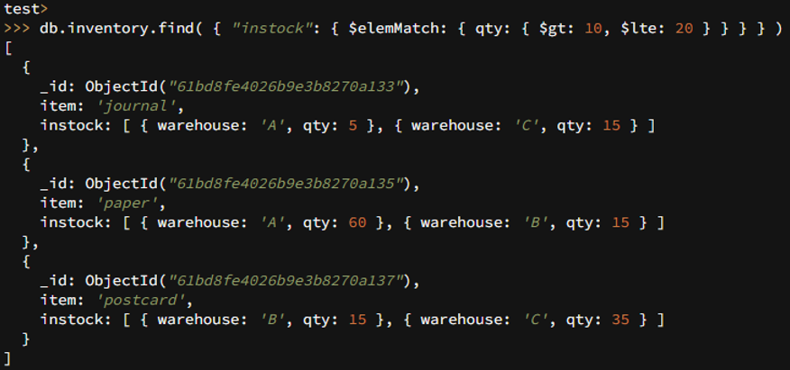 db.inventory.find( { "instock": { **$elemMatch**: { qty: { $gt: 10, $lte: 20 } } } } )