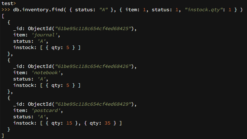 db.inventory.find( { status: "A" }, { item: 1, status: 1, "instock.qty": 1 } )