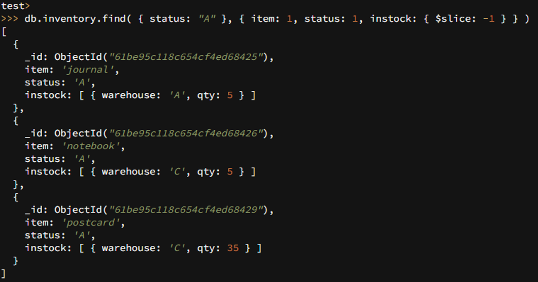 db.inventory.find( { status: "A" }, { item: 1, status: 1, instock: { $slice: -1 } } )
