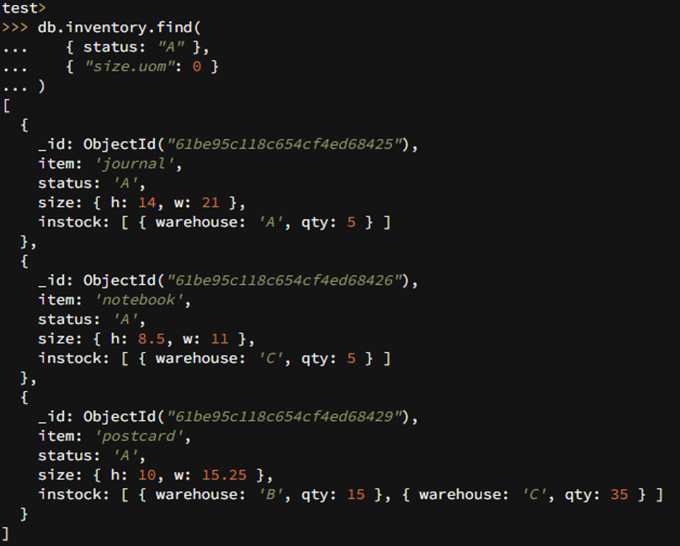 { item: "journal", status: "A", size: { h: 14, w: 21, uom: "cm" }, instock: [ { warehouse: "A", qty: 5 } ] },
