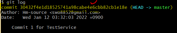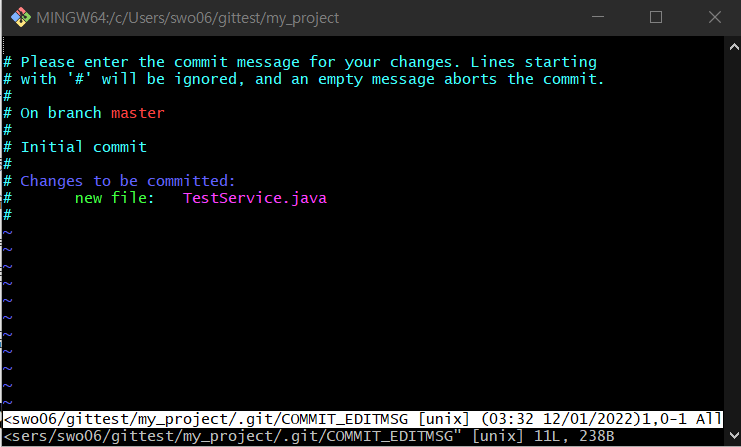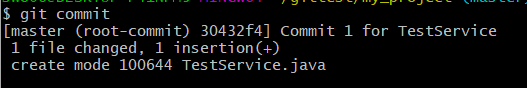 이 화면이 뜨면 i를 통해 입력모드로 바꾸어서 'Commit 1 for TestService'라는 메시지를 입력하고 Esc +:wq하면 commit됩니다.