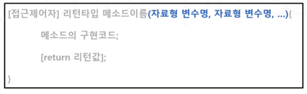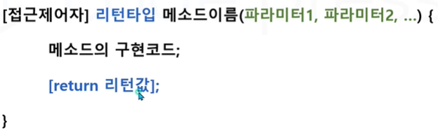 - 특정 작업을 위한 메소드의 구현 코드가 중괄호 {} 내부에 구현됩니다.