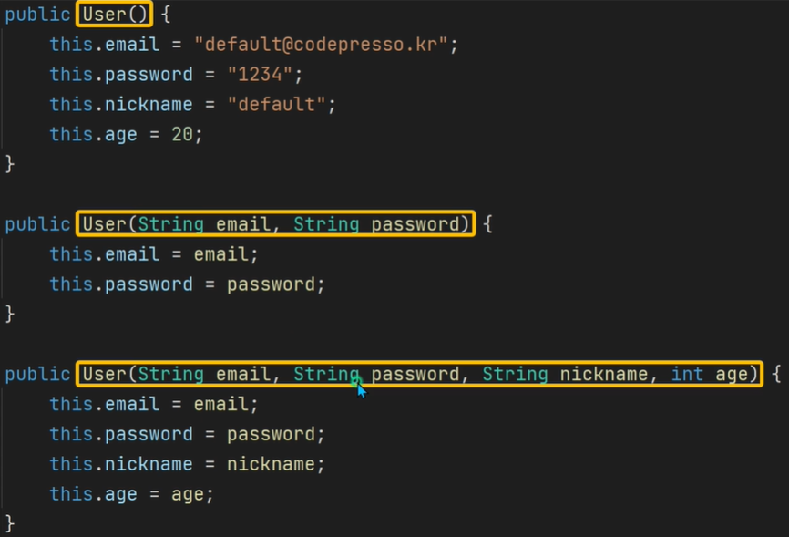 객체 생성 시 세팅하는 파라미터의 조합에 따라 서로 다른 생성자가 호출됩니다.