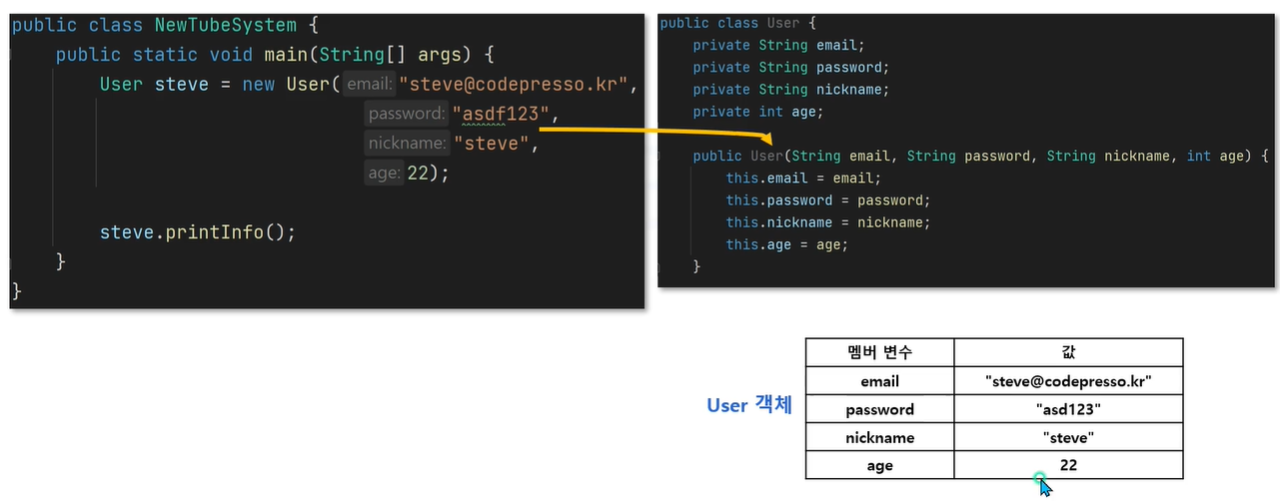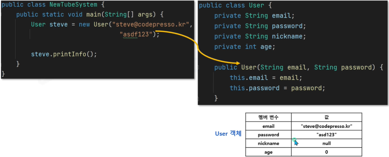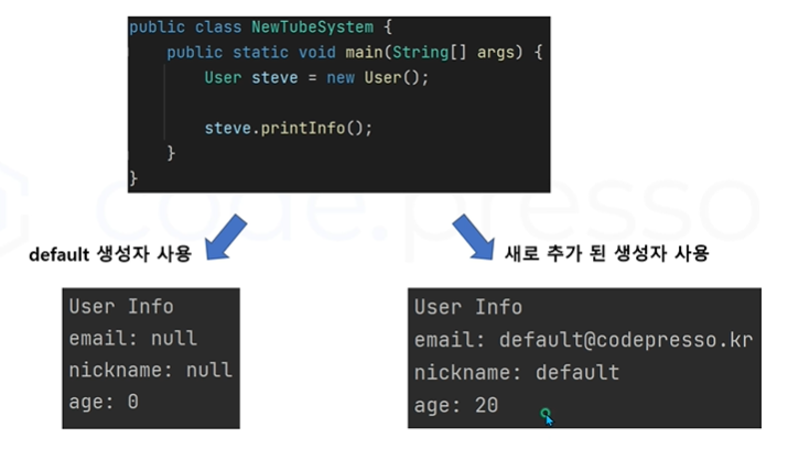 - 현재까지 사용자 객체에 생성자 존재하지 않았습니다.