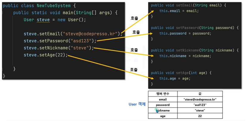 - setter 메소드로 객체 멤버 변수의 값을 변경할 수 있습니다.