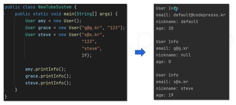 생성자에 따라 각자 다른 데이터를 출력하는 것을 볼 수 있습니다.