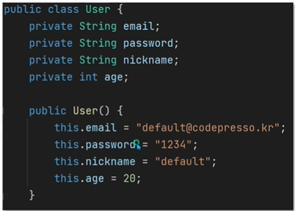 - User() 생성자 추가
