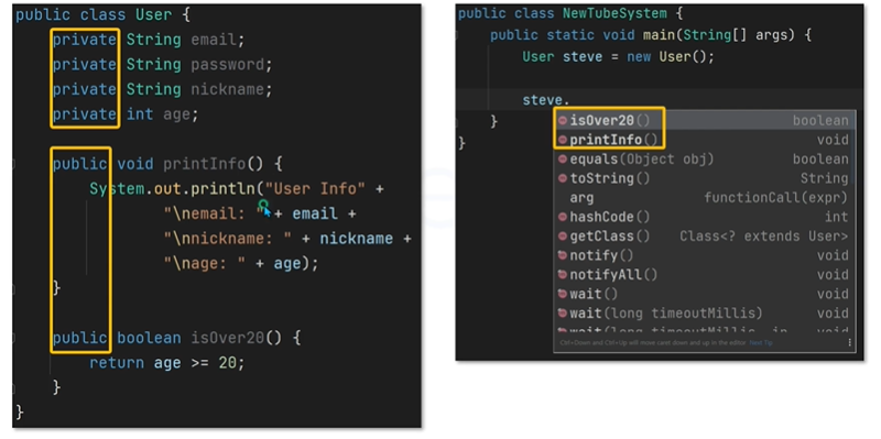 그래서 오른쪽 코드를 보면 steve라는 객체에 점 연산자를 써도 public인 메소드들은 다 나타나지만
