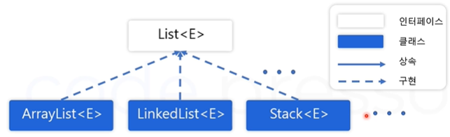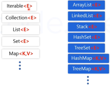 컬렉션 프레임워크의 클래스와 인터페이스들은 제네릭을 이용해 데이터 타입의 범용성을 확보할 수 있습니다.<E> ->element