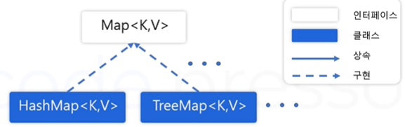 - Map 인터페이스는 구조상 차이로 Collection 인터페이스를 상속받지 않습니다.(독자적 인터페이스 구현)