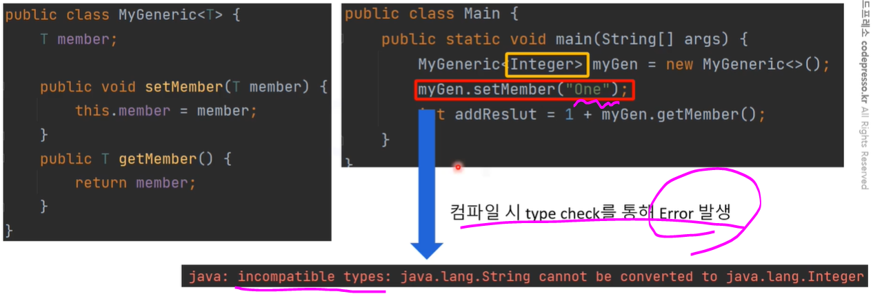 - 클래스나 메소드에서 사용할 데이터의 타입을 컴파일 시 type check 하여 런타임 시의 안정성이 보장됩니다.