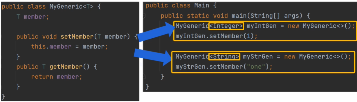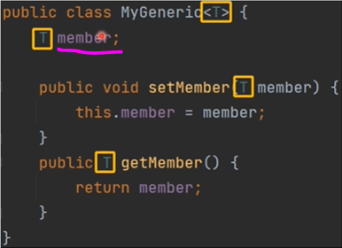 -> 클래스 내에서 제네릭 한 데이터 타입을 쓰겠다고 하면 클래스 이름 옆에 <> 안에 type variable을 넣어주면 멤버 변수 타입, 리턴 타입, 인자 타입 등을 지정할 수 있습니다.