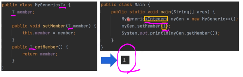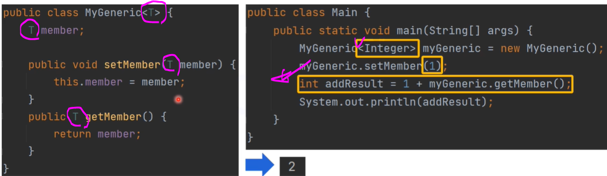 T로 설정한 제네릭이 Integer로 치환돼서 메서드를 우리가 사용하고 싶은 데이터 타입으로 사용할 수 있습니다.