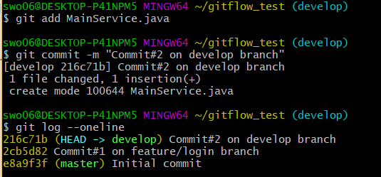 (git log 명령어를 통해 develop 브랜치에 commit#1이 들어있는 것을 볼 수 있습니다.)