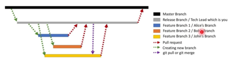 위의 사진처럼 master branch가 있고 release branch, feature branch 1,2,3... 등 여러 브랜치들이 생성되기도 병합되기도 합니다.