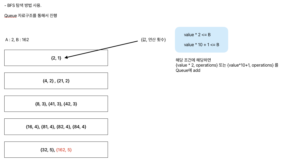 - BFS 를 통해서 B까지 도달할 수 있는 가능한 연산 횟숫를 찾고자 하였다.