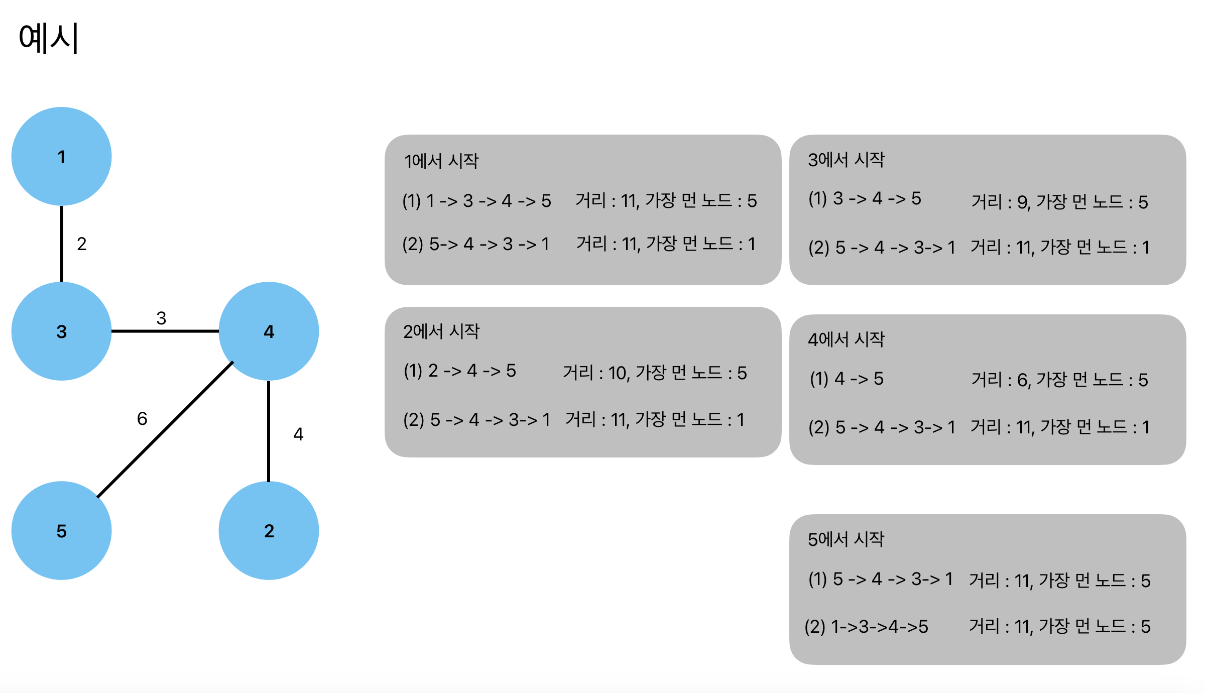 - 각 노드에서 제일 먼 노드까지의 거리를 구해보면 아래 예시와 같다.